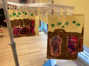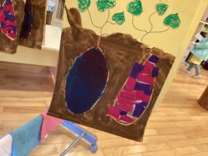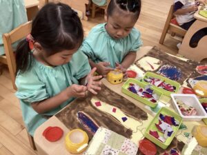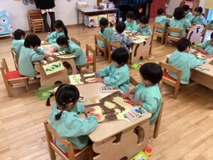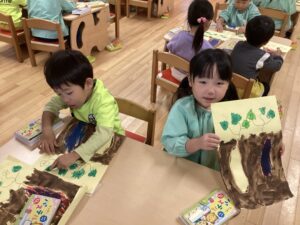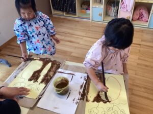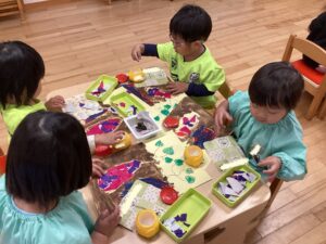 中には、「青にしか見えないよ〜、?」と上手く混ざり合わず、不安そうな子もいましたが、何回か重ね塗りをしていくと、無事に紫のお芋が完成‼️