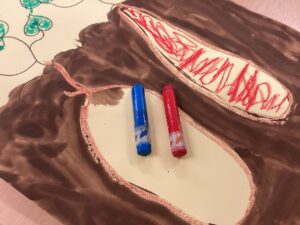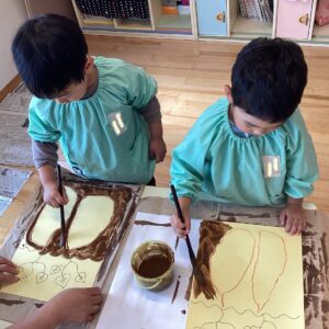 クレヨンで大きなお芋を描き、土は絵の具で、はじき絵に挑戦です🎨