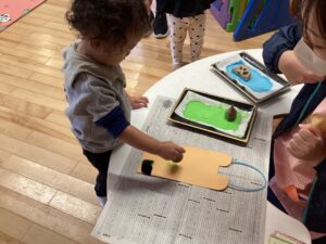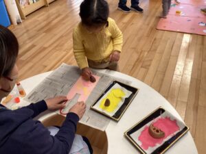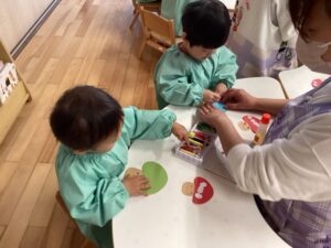 中には、「青にしか見えないよ〜、?」と上手く混ざり合わず、不安そうな子もいましたが、何回か重ね塗りをしていくと、無事に紫のお芋が完成‼️