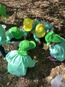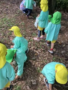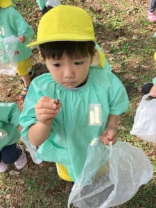 小さいどんぐりが落ちている場所もあり、用意していただいた袋に拾い始める子も