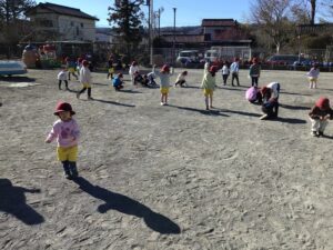 今日は午前中園庭で豆まきを行いました。